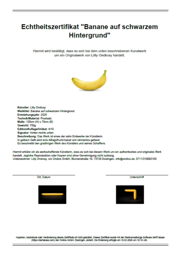 Anhand des fiktiven Werks „Banane auf schwarzem Hintergrund“ der Künstlerin Lilly Ondicsy wird ersichtlich, wie dARTabase alle Daten – von der Technik („Pixelsatz“) bis zur konkreten Auflage („4/10“) – übersichtlich aufbereitet. Das Dokument muss am Ende lediglich mit Ort, Datum und Unterschrift versehen werden.
